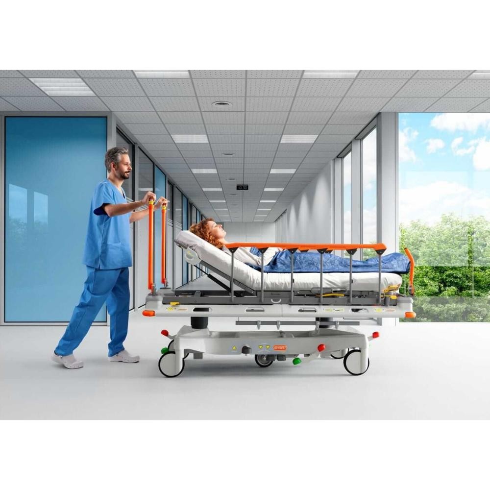 Graças ao inovador conceito IV&Drive®, a equipe de enfermagem pode empurrar a maca de qualquer altura.