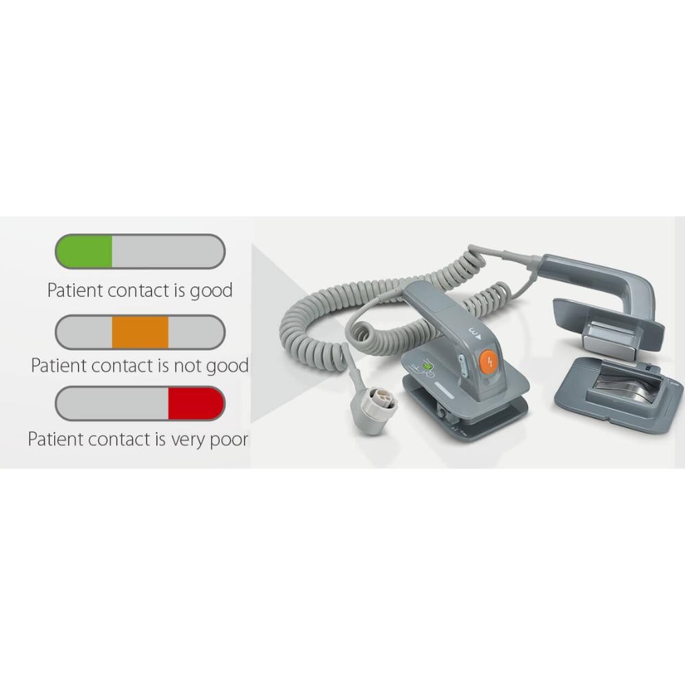 Indicadores de contato do paciente, fornecem o status visual na pá e na tela, mostrando o contato da pá para garantir a eficiência da descarga.